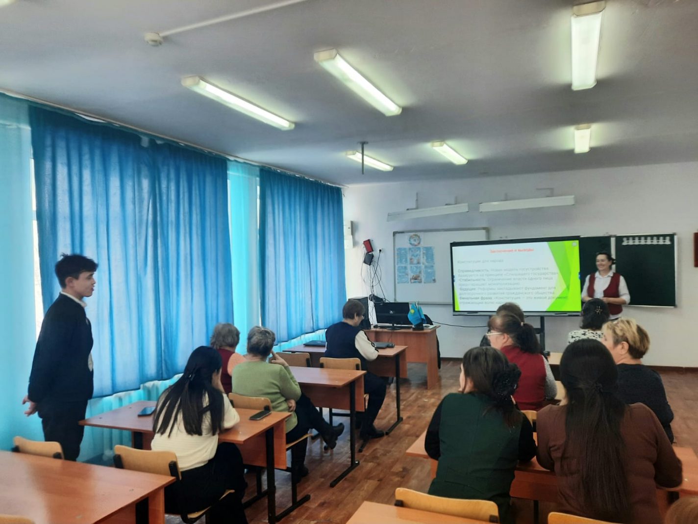 9 ақпанда мектепте "Қазақстан Республикасының өзекті Конституциялық моделі: мемлекет, қоғам және құқық арақатынасы" тақырыбында семинар-диалог өтті. Семинар барысында Қазақстан Республикасы Конституциясының Конституция мен заңның үстемдігі қағидаты, биліктің бөлінуі, адам мен азаматтың құқықтары мен бостандықтары, әлеуметтік әділеттілікті қамтамасыз етудегі мемлекеттің рөлі, сондай — ақ қазіргі жағдайдағы мемлекеттің, қоғамның және құқықтың өзара іс-қимылының тетіктері сияқты негізгі ережелері қаралды құқықтық мемлекет. Іс-шара қатысушылардың құқықтық сауаттылығын арттыруға және белсенді азаматтық ұстанымды қалыптастыруға ықпал етті.